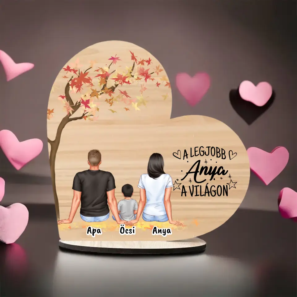 Anyák napi Fa Asztali Dísz - Anya, Apa és akár 3 gyermek - Személyre szabható karakterekkel