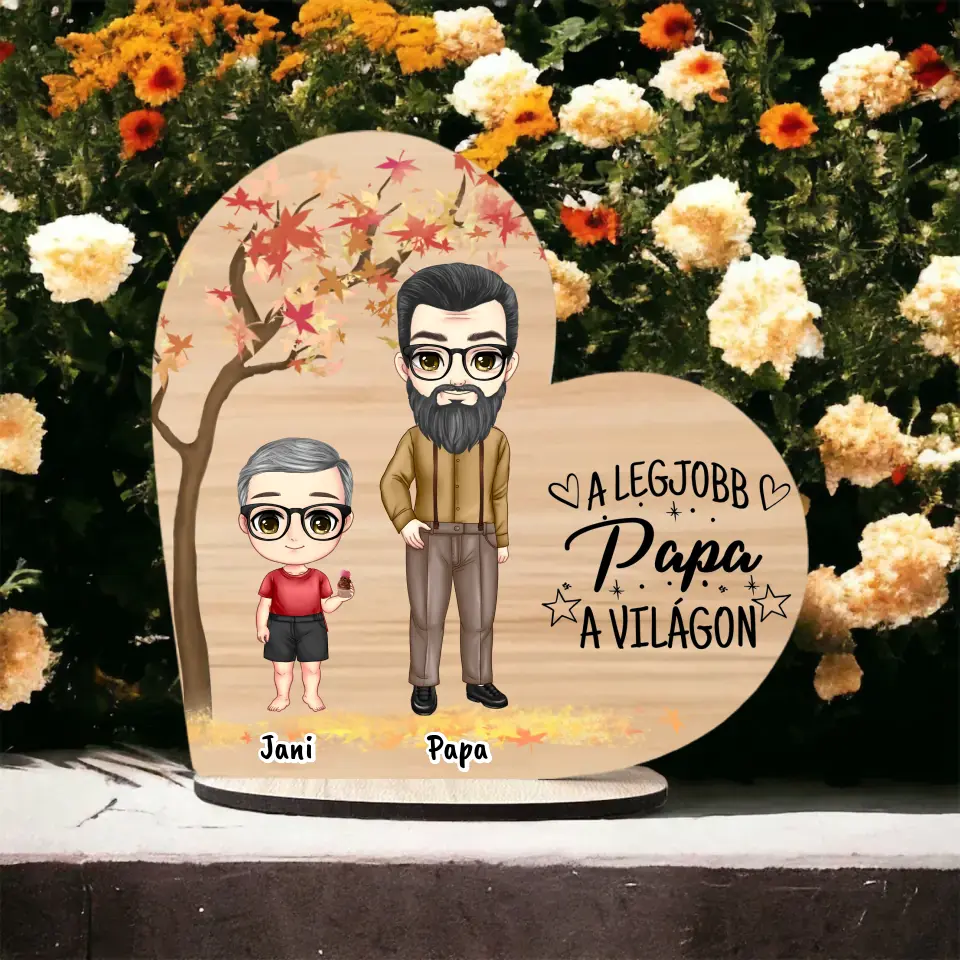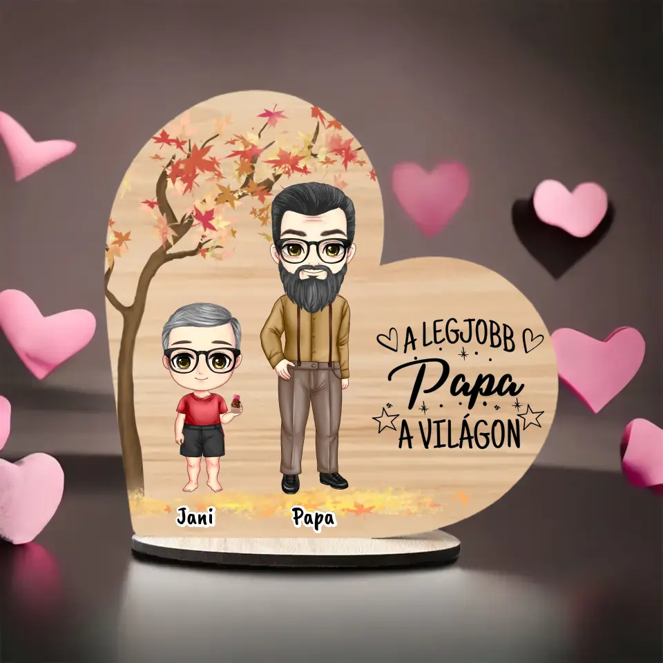 Apák napi Fa Asztali Dísz - Papa és akár 3 gyermek - Személyre szabható karakterekkel