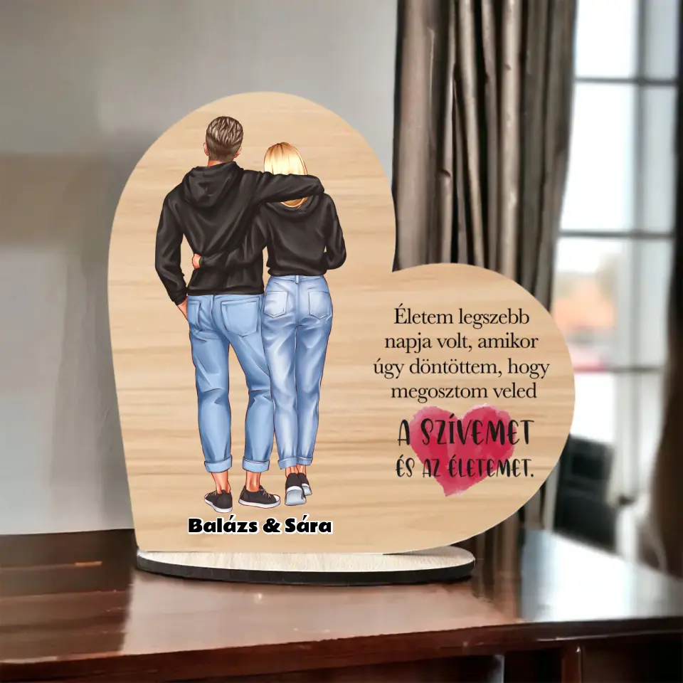 Valentin napi Fa Asztali Dísz - Álló Ölelkező Pár - Választható Idézettel